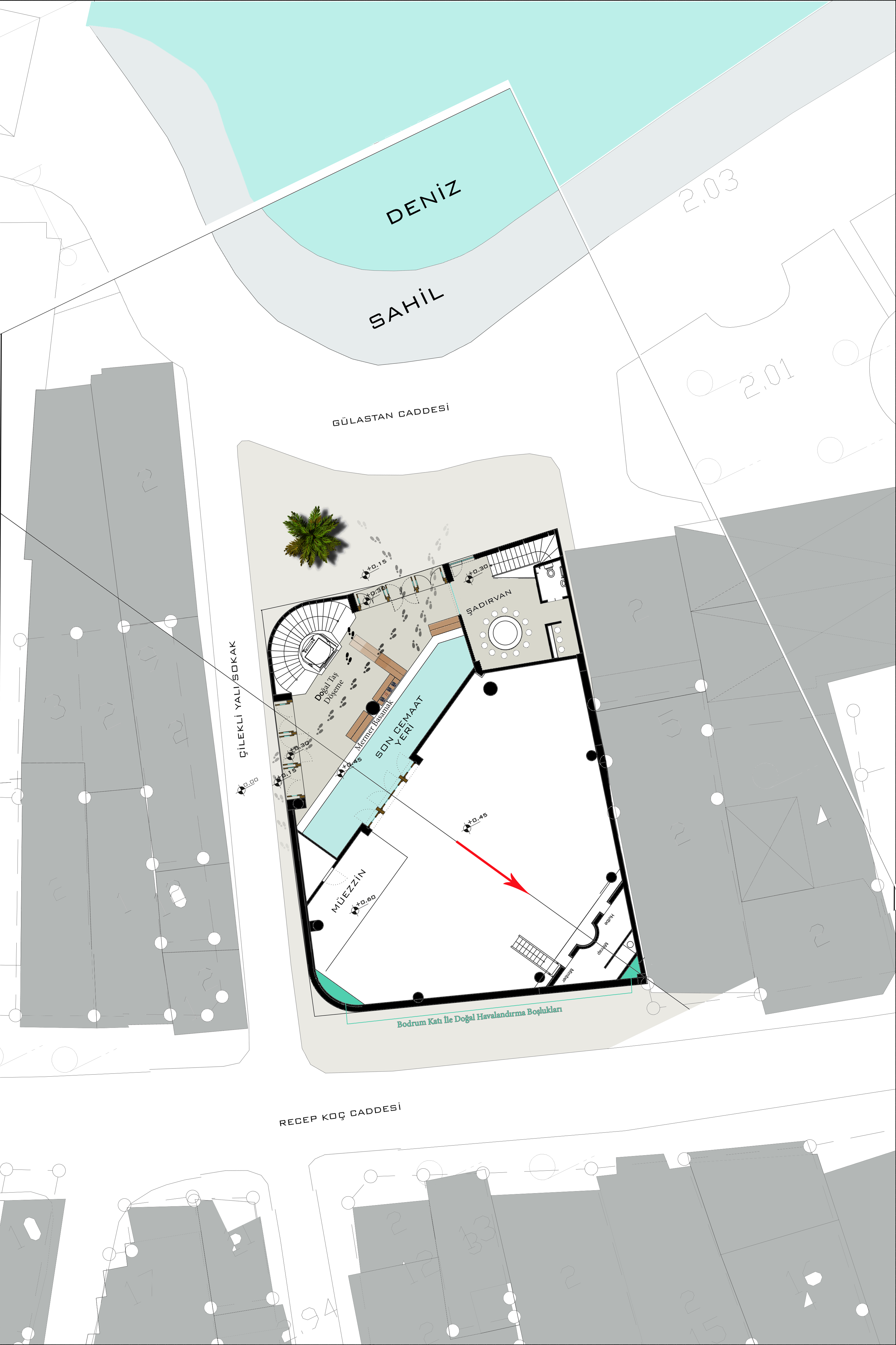 Geniş camii kapıları planlanarak kapalı bir avlu yaratılıp